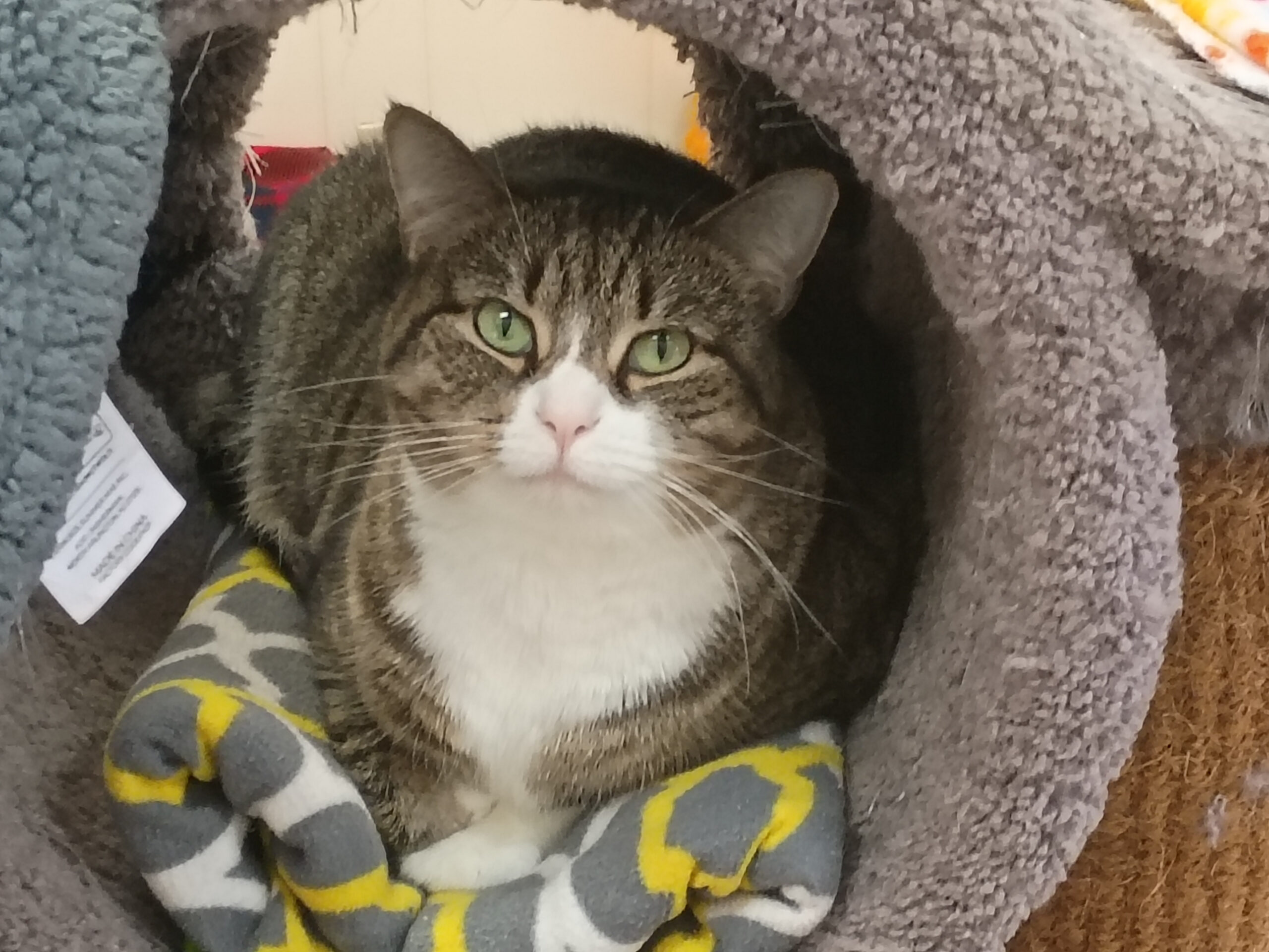 Tuesday AM boxes cleaned, floor swept. 3 cups of food with Lysine. Chester was a bit of a bully to Pasha & wouldn’t let her come out to play. Treats & pets given to all. 2 pee blankets & 1 pee spot.